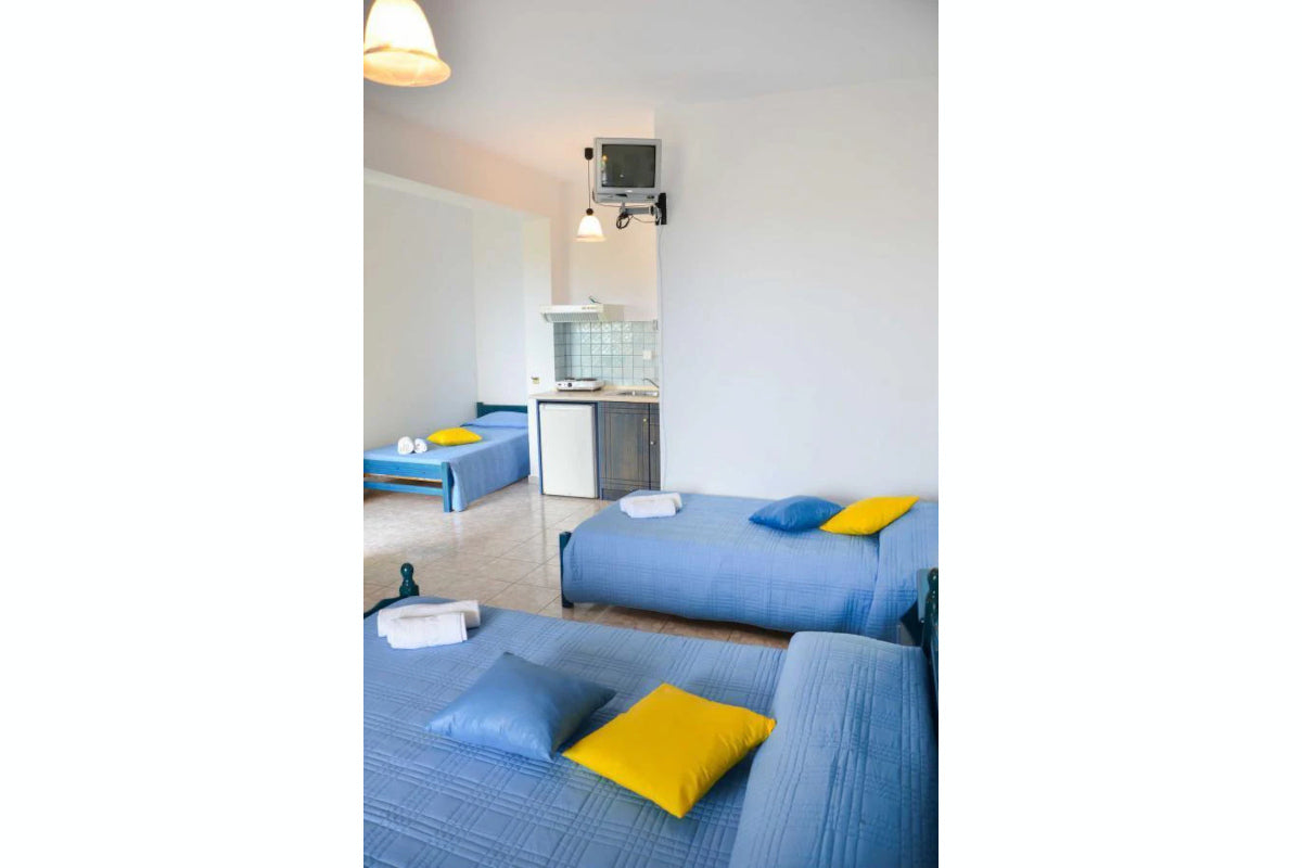 Si tratta di piccoli studios monolocali forniti di tutto l'occorrente per un soggiorno, piccola cucina attrezzata, bagno con doccia, veranda o balcone privato e tutti gli alloggi offrono vista sul Mar Egeo. Inserisci le date che ti interessano e il numero di persone per scoprire prezzi e disponibilità odierna per riservare l'alloggio. Senza perdite di tempo e intermediazioni.Prima spiaggia: 500m Taverna: 400m Myrina: 2km Porto: 3km Aeroporto: 20km