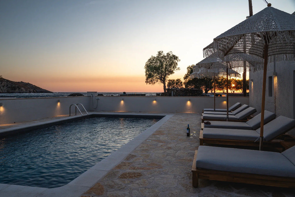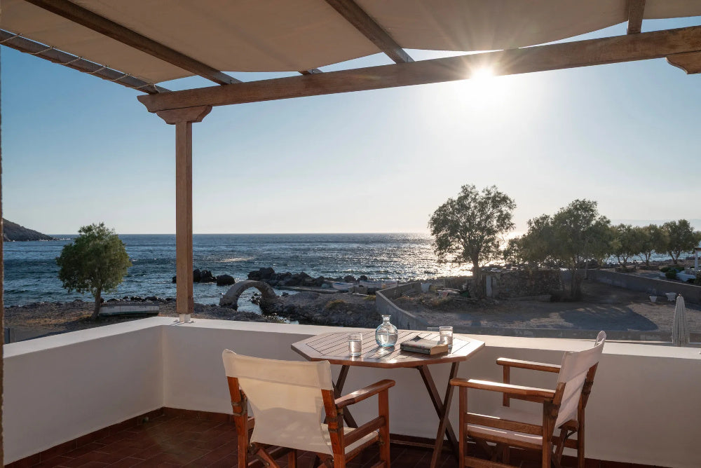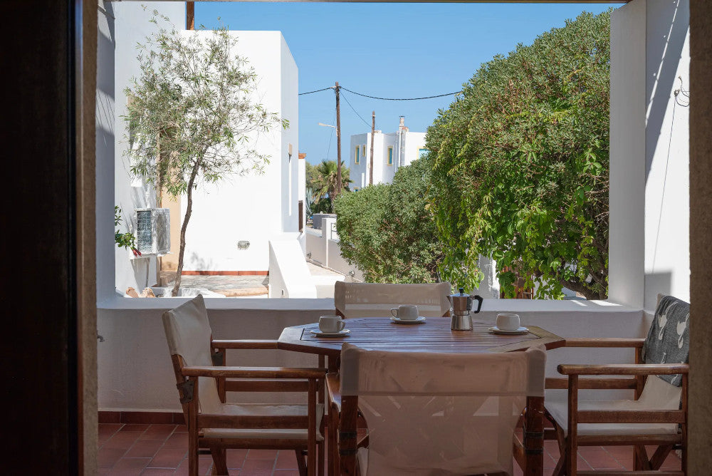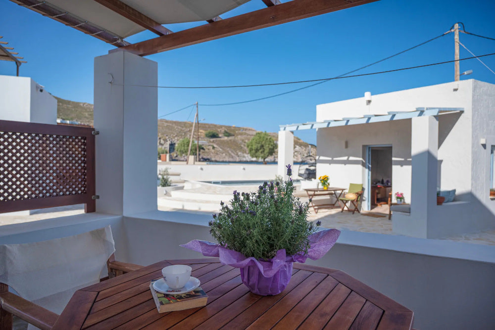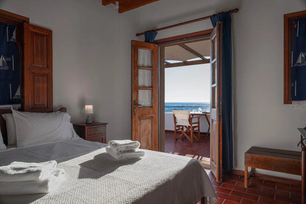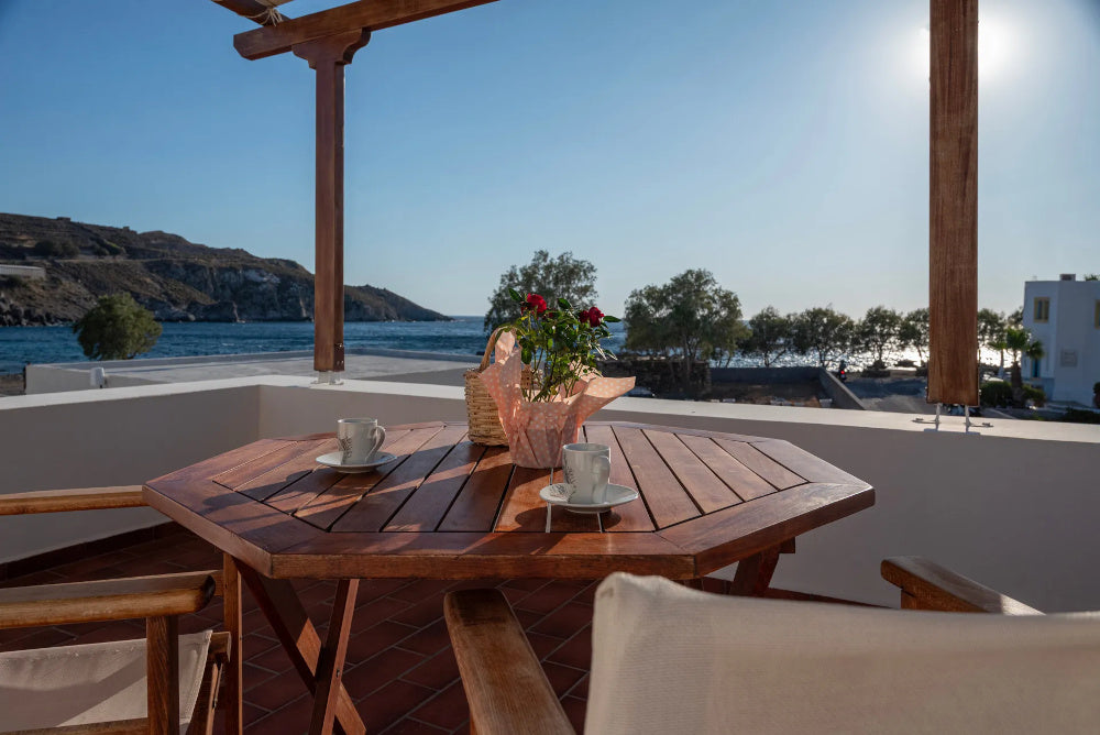 Ognuno dei monolocali dispone di un balcone privato con vista mare; immaginate di svegliarvi con la dolce brezza dell'Egeo, di uscire sul vostro balcone con il mare che si estende davanti a voi e di gustare una colazione tranquilla mentre la luce del mattino danza sull'acqua.